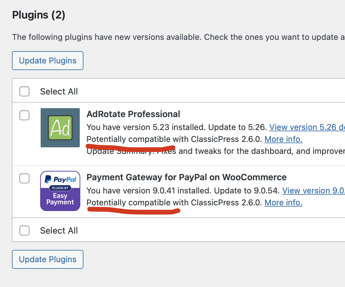 There’s also a ClassicPress tag for WP plugins by the way. I suggested to use that tag to let CP know the (WP) plugin is (potentially) compatible (potentially, because it doesn’t return the CP version of course). But including this in core seems to be difficult.